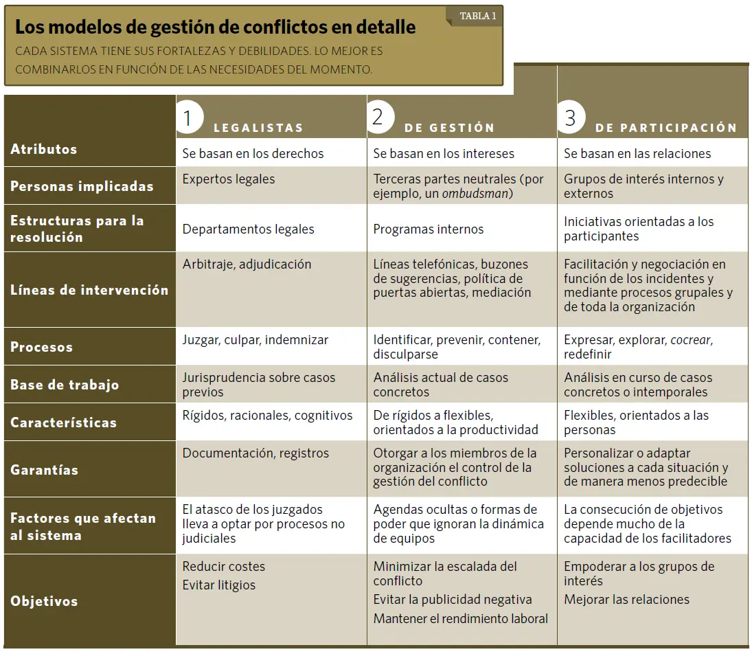 En líneas generales, las compañías recurren a tres tipos de sistemas para reducir, mitigar o resolver conflictos: basados en la legalidad, en la gestión y en la participación. Cada modelo presenta fortalezas y debilidades. Las expongo a continuación para ayudar a las empresas a hacer más eficaces sus propios métodos en función de la naturaleza del conflicto que afronten.