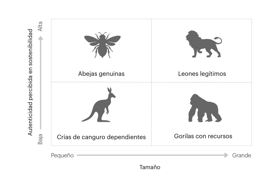En sostenibilidad, las empresas con poco poder de referencia –los “gorilas con recursos” – deben asociarse con actores muy creíbles, como las “abejas genuinas” o los “leones legítimos”, para influir en los grupos de interés dispersos. A la inversa, aquellas que carecen de poder coercitivo, como las “abejas genuinas”, pueden recurrir al respaldo de los “gorilas con recursos” para influir en los grupos de interés centralizados.