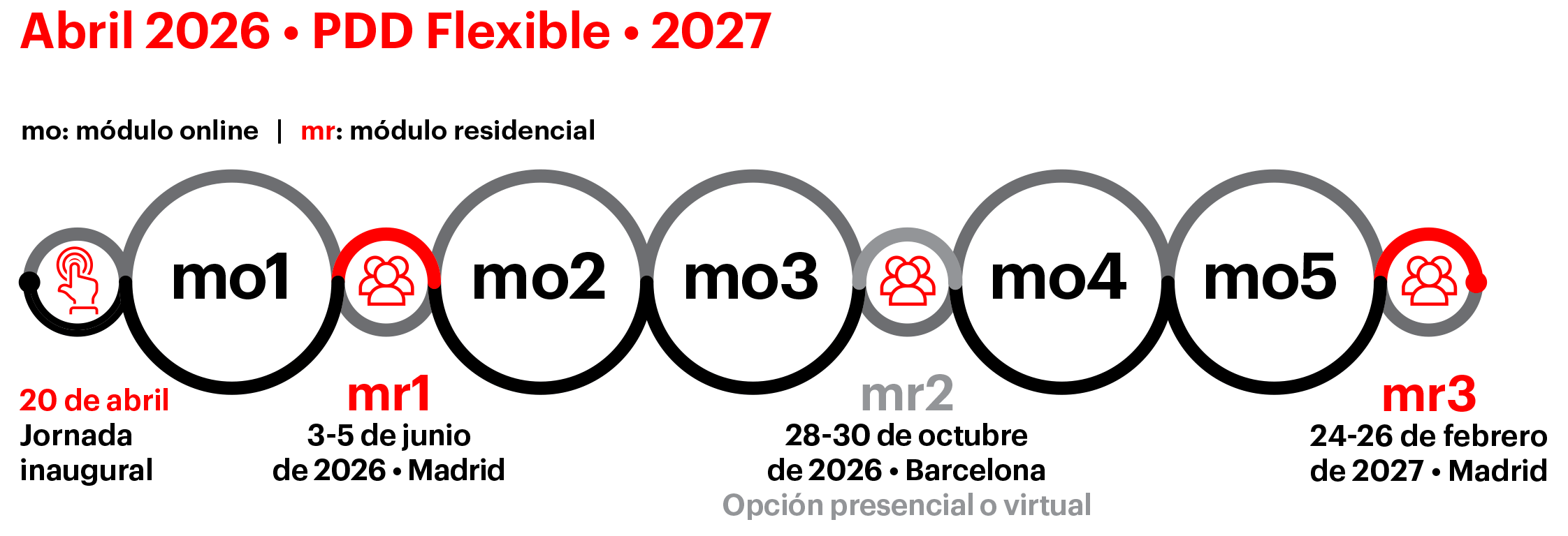 El Programa de Desarrollo Directivo (PDD) del IESE en su modalidad flexible, te ayuda a consolidarte hacia la alta dirección y te prepara para liderar el futuro. Fórmate en una de las escuelas de negocio más prestigiosas del mundo, sin importar en que parte del mundo te encuentres.