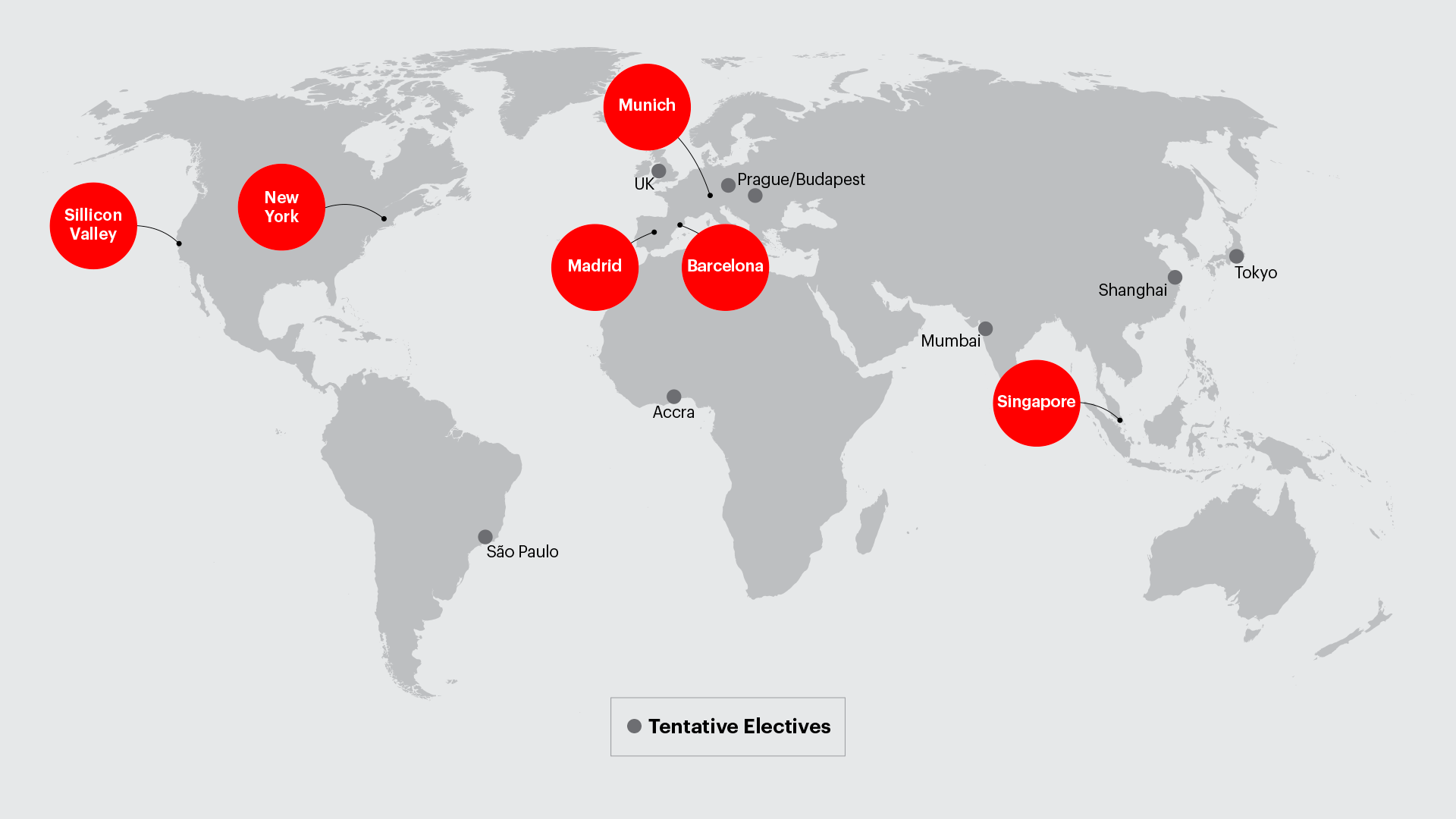 The GEMBA is a 16-month, part-time, modular, blended and flexible program designed for high-achiever senior professionals with 10+ years of experience. It combines distance learning with intensive in-person modules across global business hubs. The journey takes you to IESE campuses in Barcelona, Madrid, Munich, and New York, and extends to dynamic business hubs such as Singapore and Silicon Valley. Additionally, the elective and exchange modules further enhance the program’s global reach, taking participants to various additional cities such as São Paulo, Shanghai, Tokyo, or Accra, depending on the year. Participants represent over 30 nationalities and a wide range of industries, creating a rich, multicultural learning environment.
