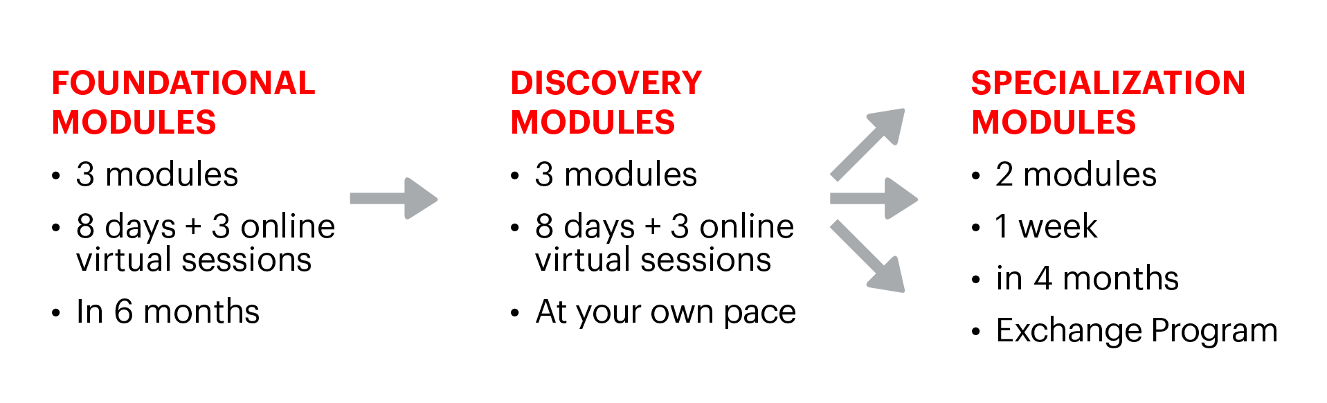 The program consists of six core modules, three Foundational and three immersive Discovery modules, along with the option to select two Specialization electives to tailor your learning experience. Its flexible format, which combines residential modules and distance learning, reinforces learning through a stimulating blend of rigorous academic content and experiential and action-oriented learning methodologies.